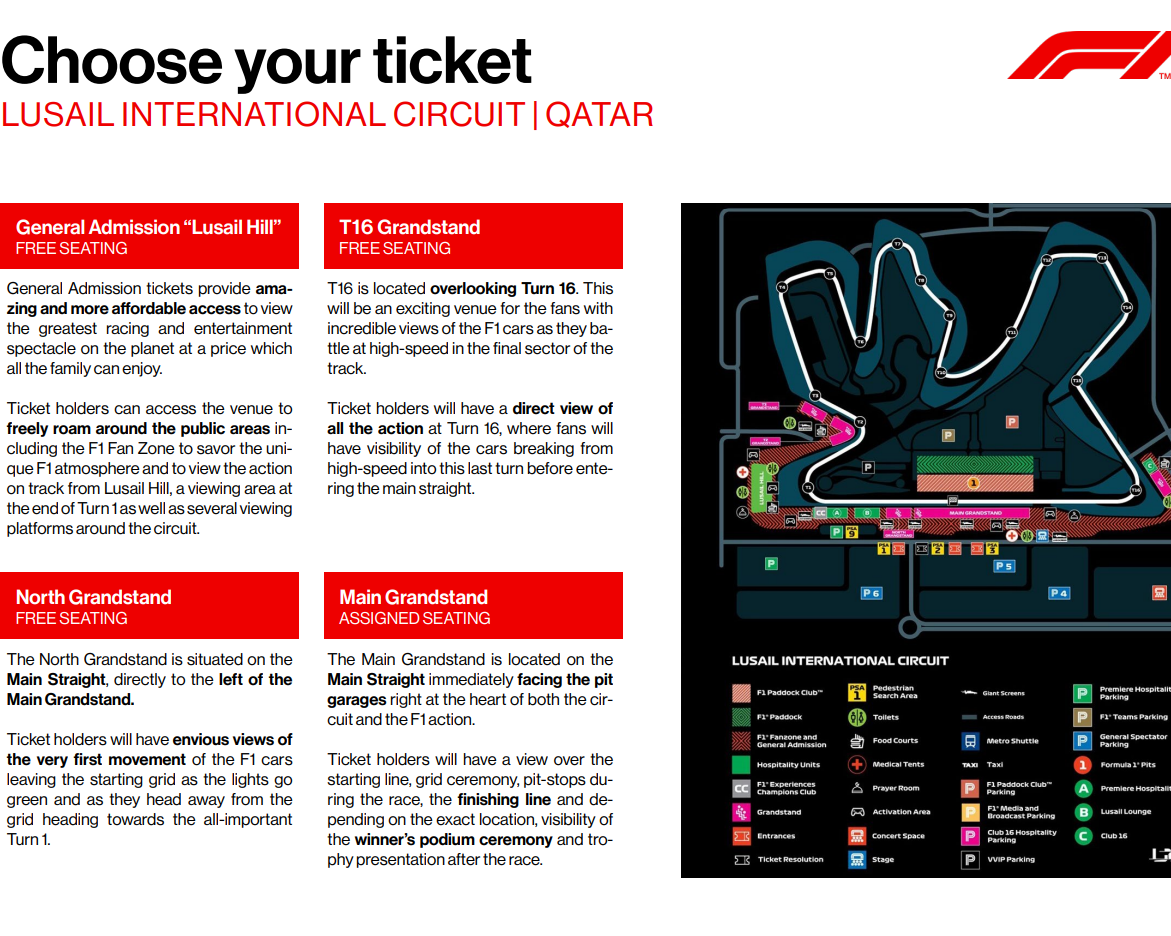 Las entradas generales ofrecen un acceso increíble y más asequible para ver el mayor espectáculo de carreras y entretenimiento del planeta a un precio que toda la familia puede disfrutar. Los titulares de las entradas pueden acceder al recinto para recorrer libremente las zonas públicas, incluida la F1 Fan Zone, para saborear el ambiente único de la F1 y ver la acción en la pista desde Lusail Hill, una zona de observación situada al final de la curva 1, así como desde varias plataformas de observación situadas alrededor del circuito.